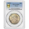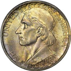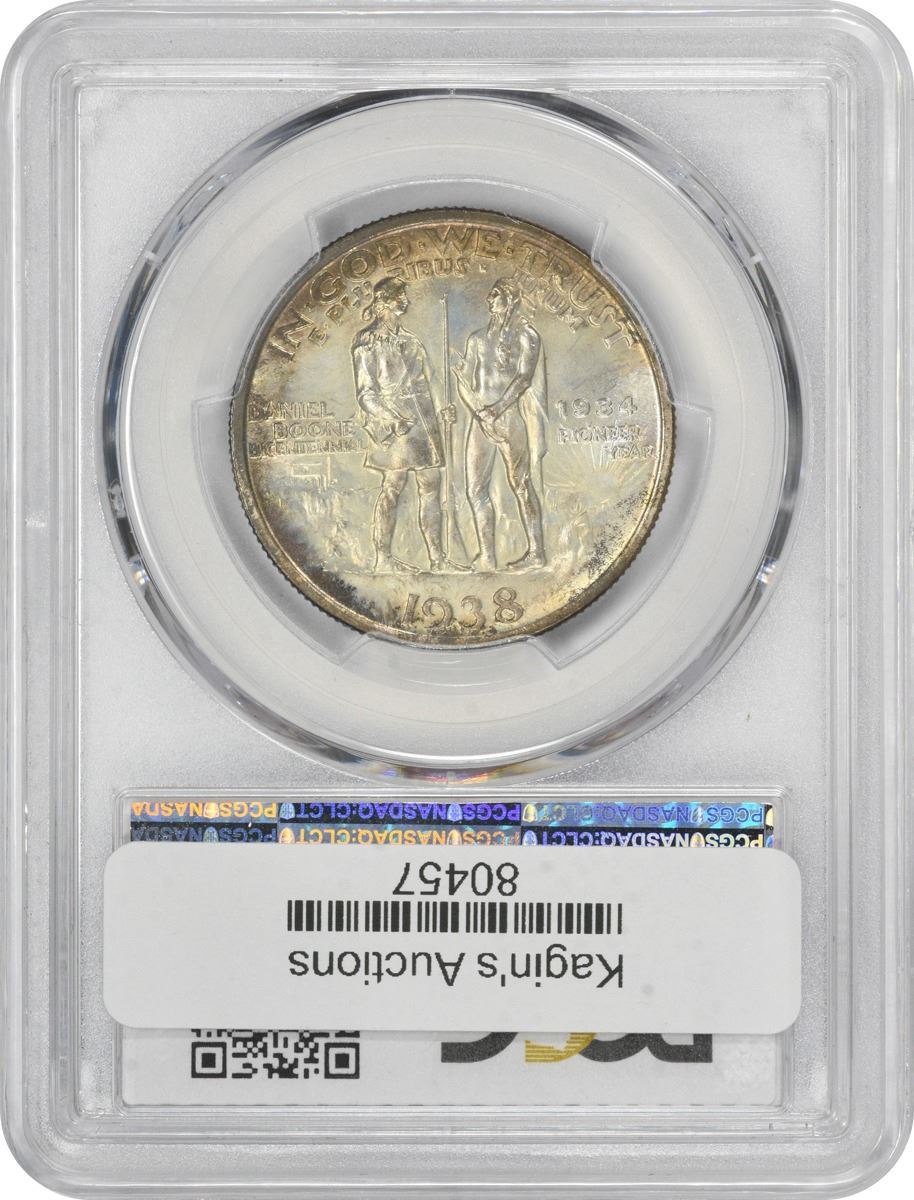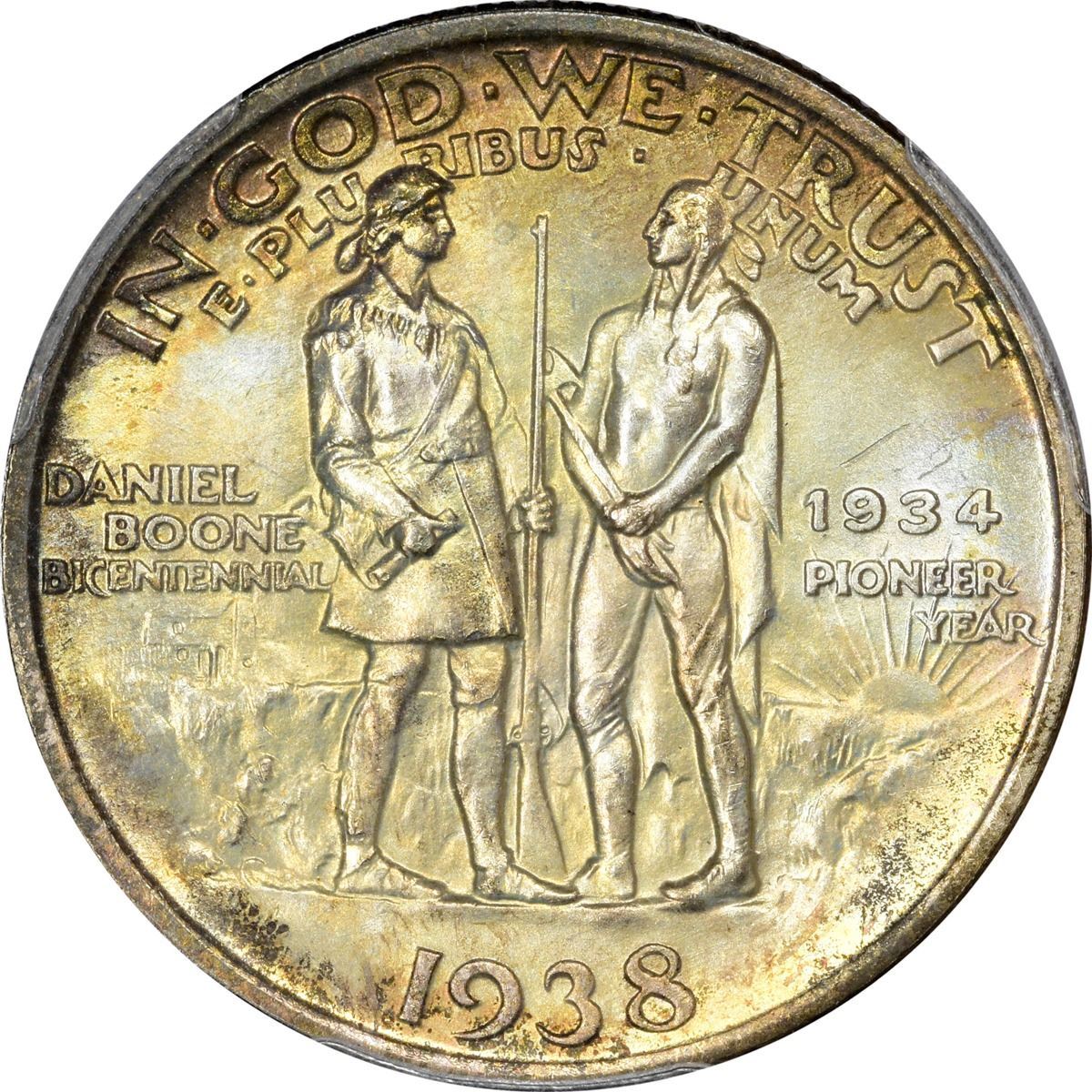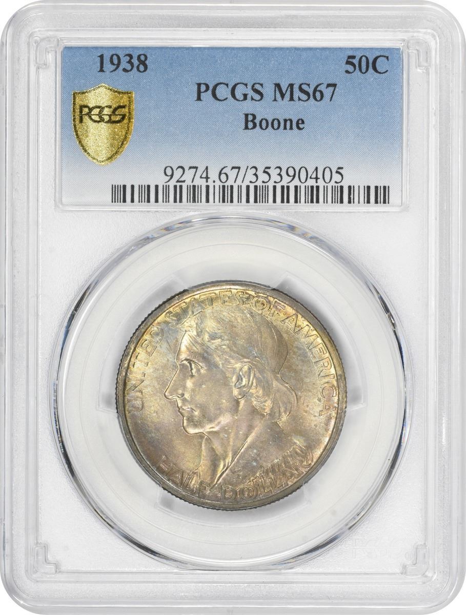 1938 Boone 50¢. MS-67 PCGS. This boldly lustrous Gem is the artist’s canvas for an all-engaging display of pale pastel rose, gold, and peach that engulfs both sides. The strike is sharp and the overall appearance is nearly ethereal. Choice for the grade. This popular design shows Daniel Boone with Blackfish, Chief of the Shawnee Indian Tribe in Chillicothe. Designer: Augustus Lukeman.