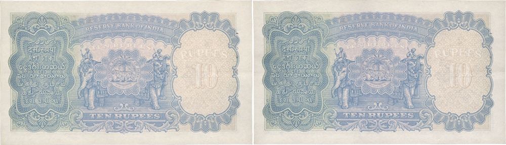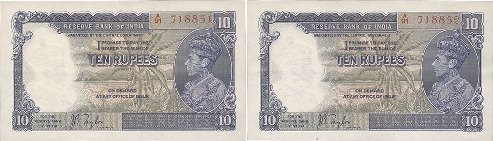 King George VI,1938, 10 Rupees (2),consecutiveserial numbers,signed by J.B. Taylor,APrefix,Serialno in Red, SL. No. A91 718851,718852,(KJ RR # 4.5.1),both UNC, excellent paper quality,Rare.