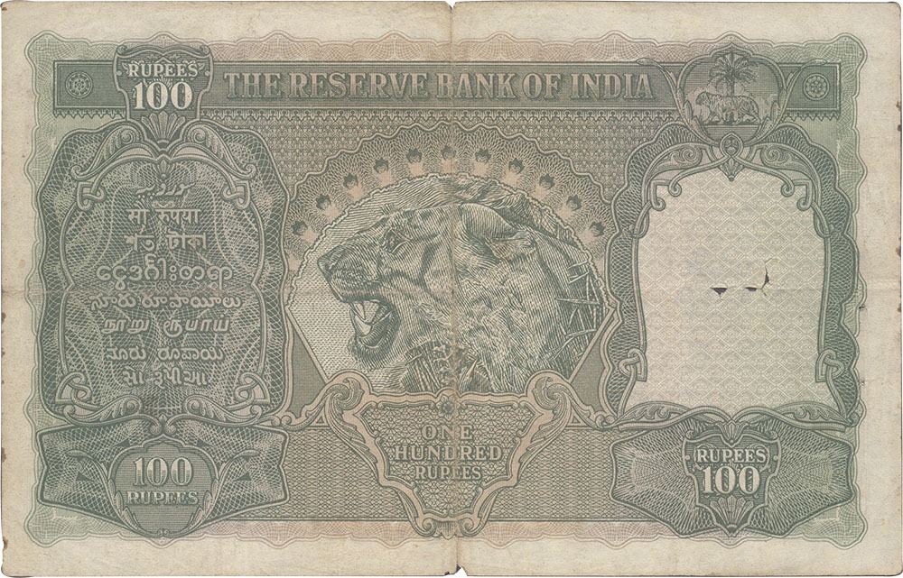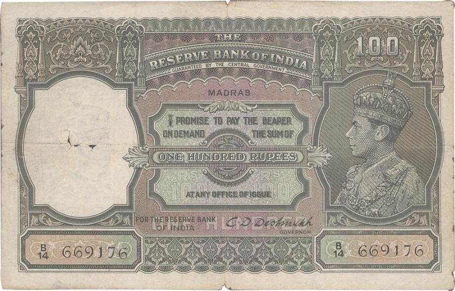 King George VI, 1938, 100 Rupees, First Issue, Madras Circle,Signed by C D Deshmukh, B Prefix, serial no in black, S.No. B14 669176, thread hole, folded, stained, (KJ RR # 4.7.2H),about very fine.