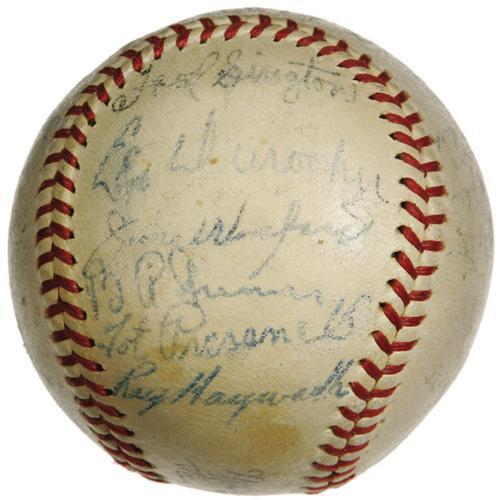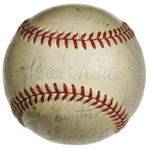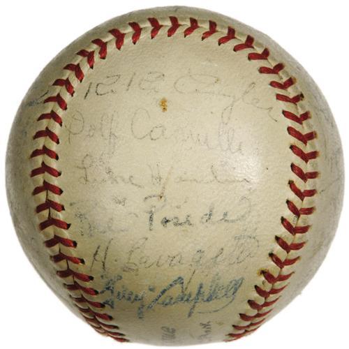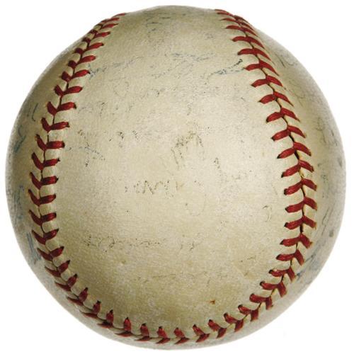 <B>1938 Brooklyn Dodgers Team Signed Baseball with Babe Ruth.</B></I> In a sad end to the Babe's career in baseball, he came to learn that his service to the Bums coaching staff was offered not as a stepping stone to eventual skipperhood, but only to draw fans anxious to see the faded legend smack homers during pre-game batting practice. Among the final team balls ever signed by Ruth is this ONL (Frick) sphere, where he takes his customary sweet spot position in 5/10 blue ink. Two of the four surrounding panels have failed to maintain signature legibility, but thankfully the larger names are on the panels that still present at an average of 6/10: Cuyler, Durocher, Lavagetto and Camilli among them. Thirteen legible signatures remain in total. Buy this one for the Babe though--in many ways it is as symbolic of his baseball life as the victorious team balls of the 1920's. <I>LOA from PSA/DNA. LOA from James Spence Authentication.</B></I><BR><BR><b>Shipping:</b> Balls, Pucks, etc., Small (<a target="_blank" href="http://www.heritageauctions.com/common/shipping.php">view shipping information</a>)