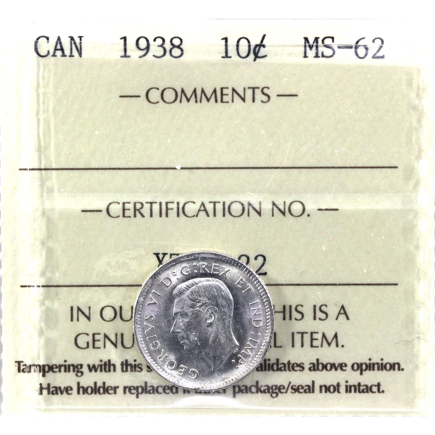 1938 Canada 10-cent ICCS Certified MS-62