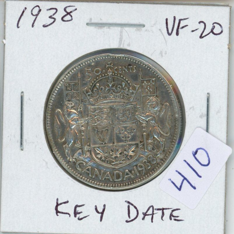 1938 Canadian Silver 50 Cents. Key Date. Mintage of 192,018. VF-20.
