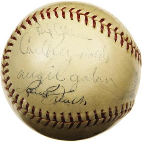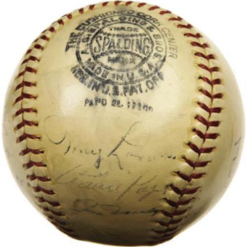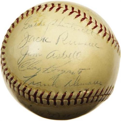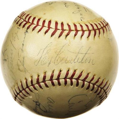 <B>1938 Chicago Cubs Team Signed Baseball.</B></I> The scrappy Cubs clawed their way back to the top of the National League for the sixth time since their last Series victory thirty years early, but the World Championship hibernation would continue thanks to a four-game Yankee sweep. Cardinals Gashouse Gang pitchers Tex Carleton and Dizzy Dean reunite here, with Gabby Hartnett and Tony Lazzeri adding further star power. Other notables: Galan, Collins, French and Russell. Fourteen autographs are here in total, averaging 7/10 on a lightly shellacked ONL (Frick) sphere, which remains housed in its original and complete Spalding box. <I>LOA from PSA/DNA. LOA from James Spence Authentication.</B></I><BR><BR><b>Shipping:</b> Balls, Pucks, etc., Small (<a target="_blank" href="http://www.heritageauctions.com/common/shipping.php">view shipping information</a>)