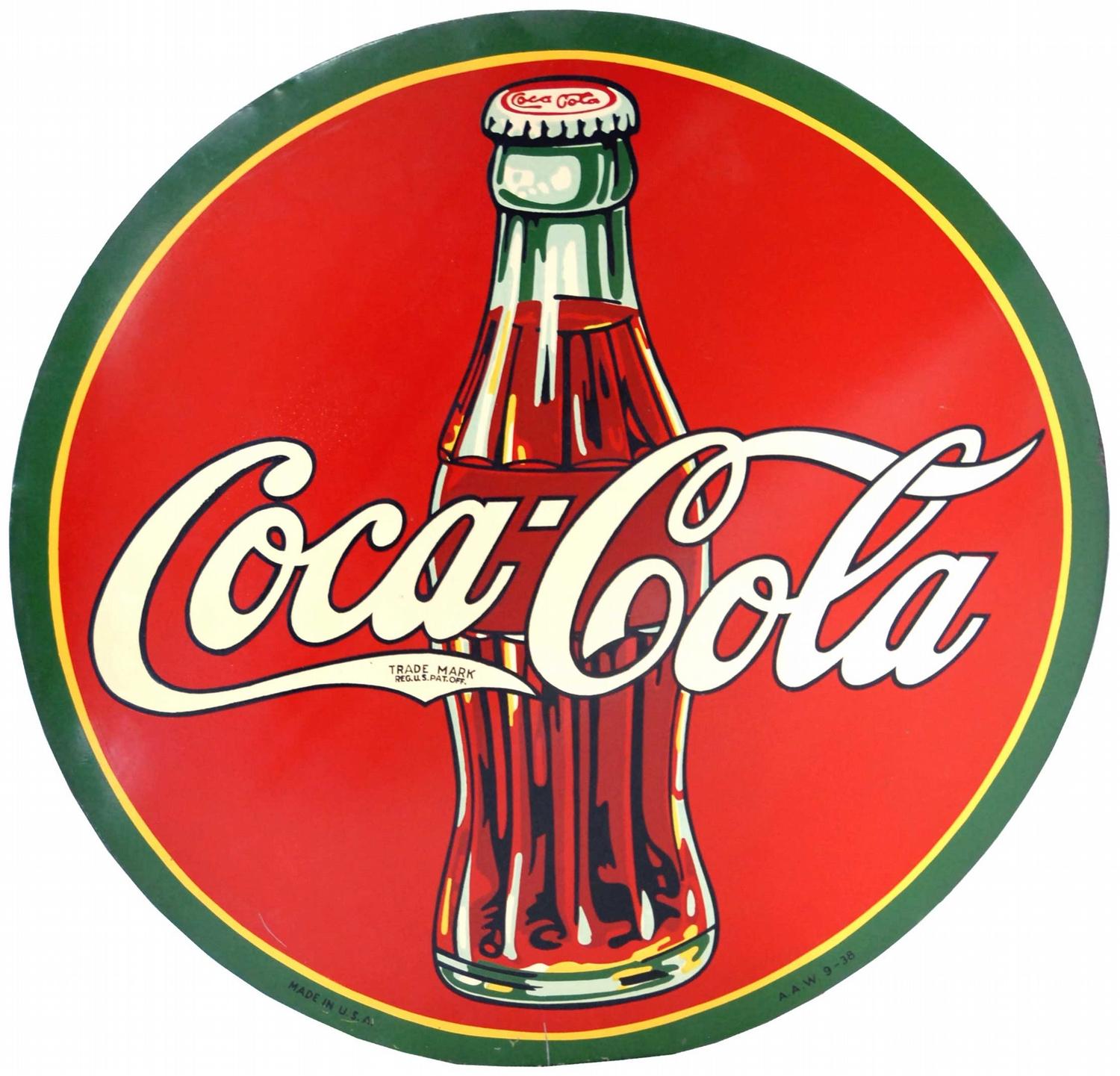 1938 Coca Cola Tin Bottle Sign. Scratch at 6:00 otherwise very good condition. 45 inch diameter.