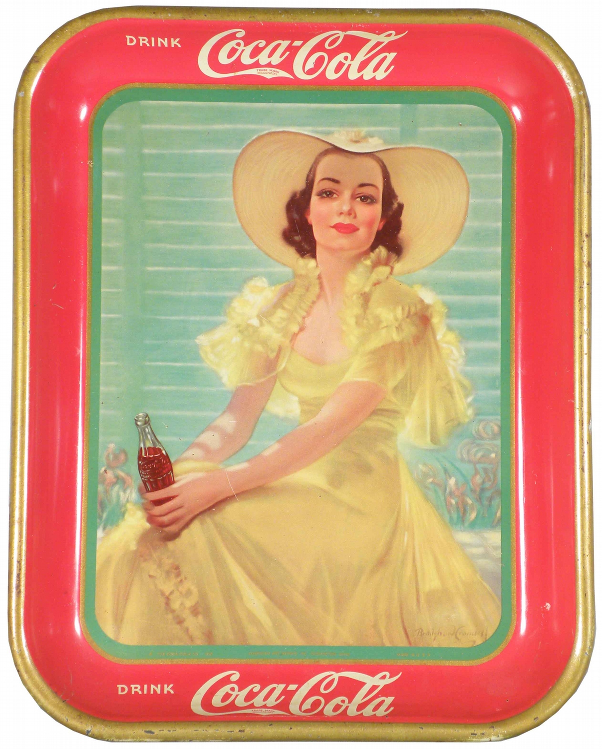 1938 Coca Cola Tin Serving Tray. Image of girl in yellow dress. Some edge ware and light surface scratches otherwise excellent condition. 10 1/2 X 13 inches.