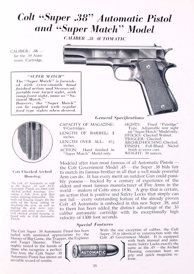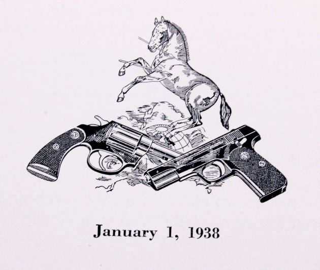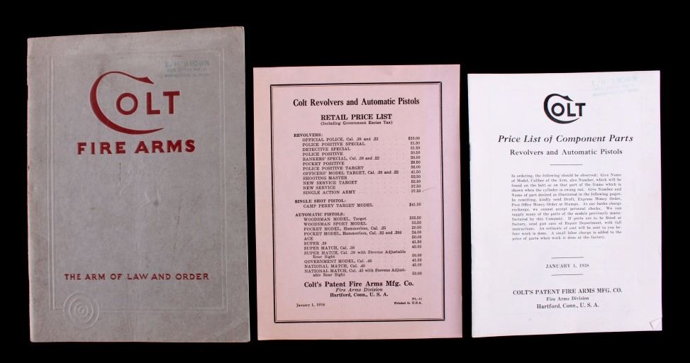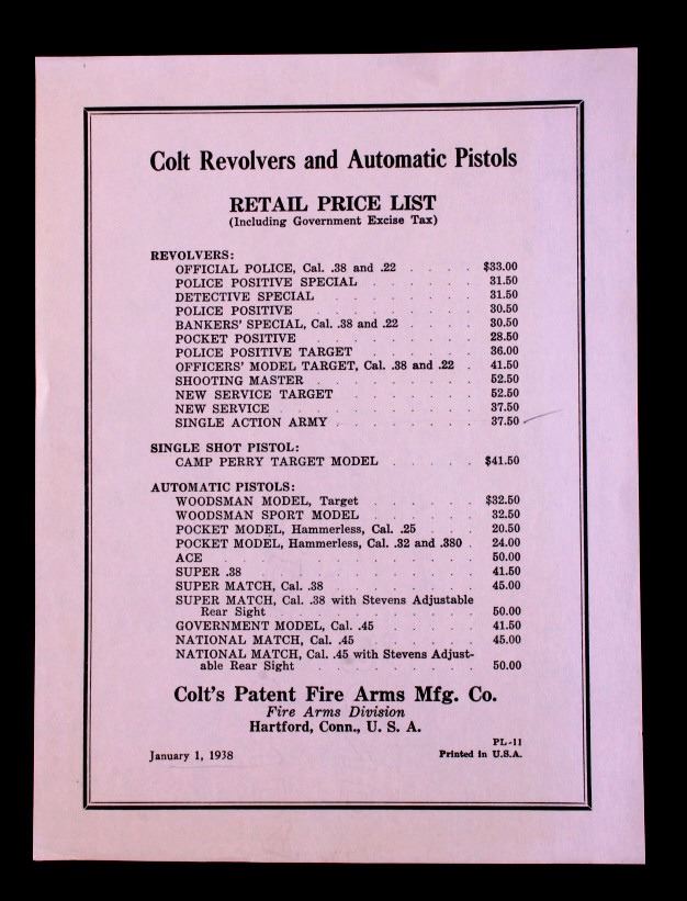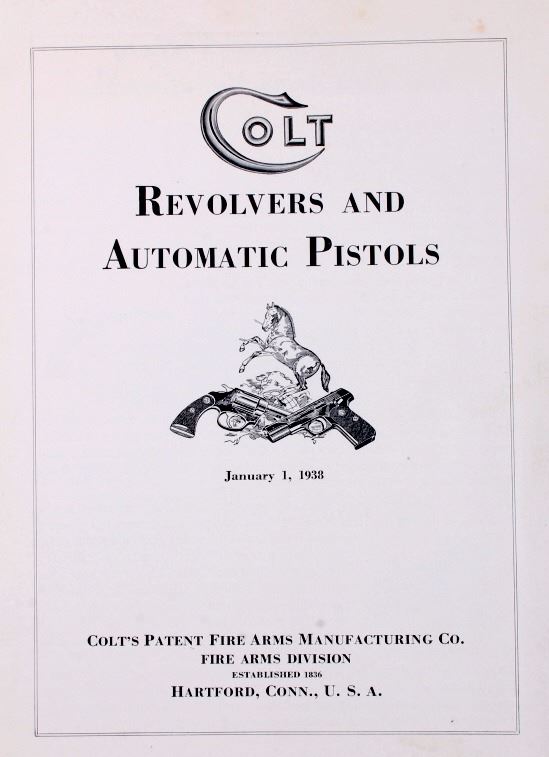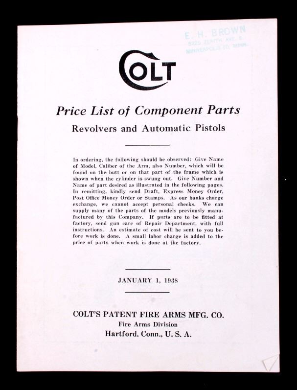 This is a 1938 "Colt Revolvers and Pistols" catalog. The catalog comes with a "Retail Price List" and a "Price List of Component Parts Revolvers and Automatic Pistols". This is a great reference and piece of Colt history. The catalog and contents are in good condition. The catalog measures 6.75" x 9.25".