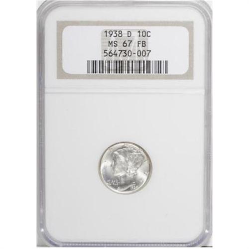 <B>1938-D 10C MS67 Full Bands NGC.</B></I> NGC Census: (148/5). PCGS Population (232/8). Mintage: 5,537,000. Numismedia Wsl. Price for NGC/PCGS coin in MS67: $240. (#5013)<BR><BR><B>Coin Engraver:</B> Adolph A. Weinman<BR><BR><b>Shipping:</b> Coins & Currency (<a target="_blank" href="http://www.heritageauctions.com/common/shipping.php">view shipping information</a>\)