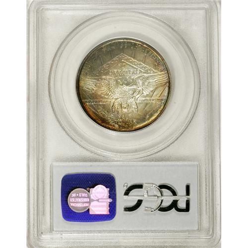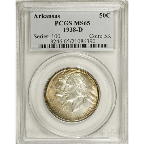 <B>1938-D 50C Arkansas MS65 PCGS.</B></I> Swirling rose, plum, and gold patina surrounds brilliant centers. Isolated, yet grade-defining marks are noted on the Indian's face and headdress, as well as the girl's neck and the field to the right. The lowest-mintage Arkansas issue of 1938, with just 3,155 pieces coined.<BR><I>From The Cary & Cheryl Porter Collection.</B></I><BR><BR><b>Shipping:</b> Coins & Currency (<a target="_blank" href="http://www.heritageauctions.com/common/shipping.php">view shipping information</a>)