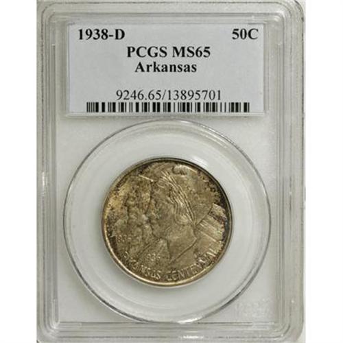 <B>1938-D 50C Arkansas MS65 PCGS.</B></I> PCGS Population (193/118). NGC Census: (160/59). Mintage: 3,155. Numismedia Wsl. Price for NGC/PCGS coin in MS65: $452. (#9246)<BR><I>From The Frank DuVall Collection of U.S. Commemoratives.</B></I><BR><BR><b>Shipping:</b> Coins & Currency (<a target="_blank" href="http://www.heritageauctions.com/common/shipping.php">view shipping information</a>\)