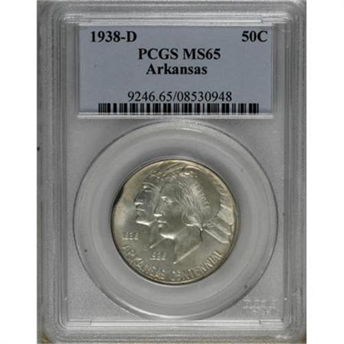 <B>1938-D 50C Arkansas MS65 PCGS.</B></I> PCGS Population (202/127). NGC Census: (161/63). Mintage: 3,155. Numismedia Wsl. Price for NGC/PCGS coin in MS65: $452. (#9246)<BR><BR><b>Shipping:</b> Coins & Currency (<a target="_blank" href="http://www.heritageauctions.com/common/shipping.php">view shipping information</a>)