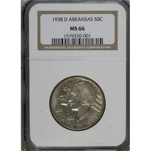 <B>1938-D 50C Arkansas MS66 NGC.</B></I> Subtle violet and gold-gray shadings grace each side of this attractive Premium Gem. Well struck and pleasingly preserved for this D-mint Arkansas issue, one of only 3,155 pieces coined.<BR><BR><b>Shipping:</b> Coins & Currency (<a target="_blank" href="http://www.heritageauctions.com/common/shipping.php">view shipping information</a>)