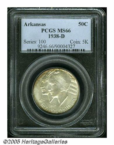 <B>1938-D<50C> Arkansas MS66 PCGS.</B></I> A minimally abraded example with overlays of milky, silver-gray patina across the interiors and bits of deep russet peripheral color. Population: 89 in 66, 8 finer (6/05).
