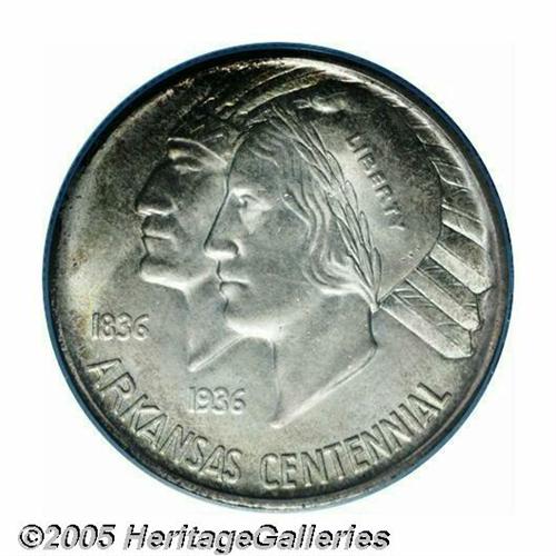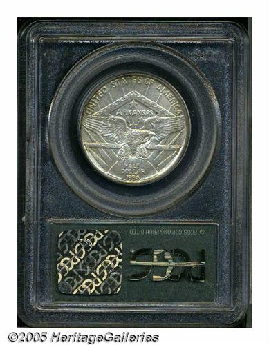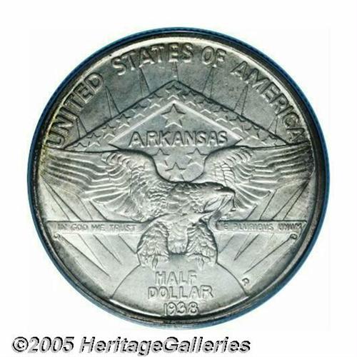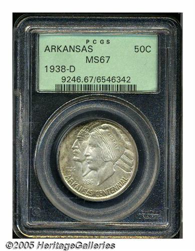 <B>1938-D<50C> Arkansas MS67 PCGS.</B></I> This issue was struck for the centennial of statehood; however, Breen suggested that locals may have regarded this more as a token of the 75th anniversary of Arkansas joining the Confederate government. This is a blatantly and attractively original Superb Gem with warm green-gold and russet obverse toning at the outer areas. The reverse shows medium golden color at the border. The fully brought up devices are free of criticism, as are the smooth, expertly preserved surfaces. Population: 8 in 67, none finer at either service (3/05).