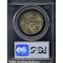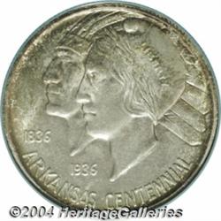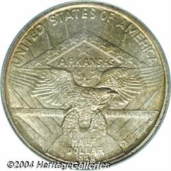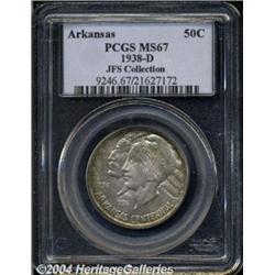 <B>1938-D<50C> Arkansas MS67 PCGS.</B></I> This issue was struck for the centennial of statehood; however, Breen suggested that locals may have regarded this more as a token of the 75th anniversary of Arkansas joining the Confederate government. This is a blatantly and attractively original Superb Gem with warm lavender obverse toning within mottled olive-russet rim accents. The reverse is even more vibrant with dappled olive-orange iridescence over a base of lavender-gray patina. The fully brought up devices are free of criticism, as are the smooth, expertly preserved surfaces. Population: 7 in 67, 0 finer (6/04).<BR><I>Ex: Long Beach Signature Sale (Heritage, 9/02), lot 9204, which realized $8,337.50.</B></I><BR><I>From the JFS Collection, the #1 All-Time PCGS Registry Set.</B></I> <BR><BR><B>Important notice:</B> Heritage usually auctions material at the rate of 200-250 lots per hour. On some occasions eBay Live bid software or the Internet may not be able to keep up with the pace of the auction. We recommend placing a realistic absentee bid now as insurance to avoid disappointment. Occasionally the auctioneer may eliminate or reject an eBay Live bid, and the auctioneer may also reopen a lot after the close of the eBay live bidding (usually because we missed an audience bid), and may reject your bid even if it shows you as the winning bidder. By bidding via eBay Live, you agree that Heritage may award the lot to another bidder at its sole discretion under the circumstances described above or any other reasonable circumstances. Since eBay bids are not shown to us until we open the lot on the floor, we treat those bids just like floor bids. In most cases the floor responds before the eBay bid is presented to us, due to Internet lag time, so for consistency we have made it a policy that floor bids are always considered first over tie eBay live bids. Also please note that all Heritage lots purchased through eBay Live carry a 20% Buyer's Premium. Please make sure you read the Terms and Conditions before you bid. </span></font></tr></table></td></tr></table>