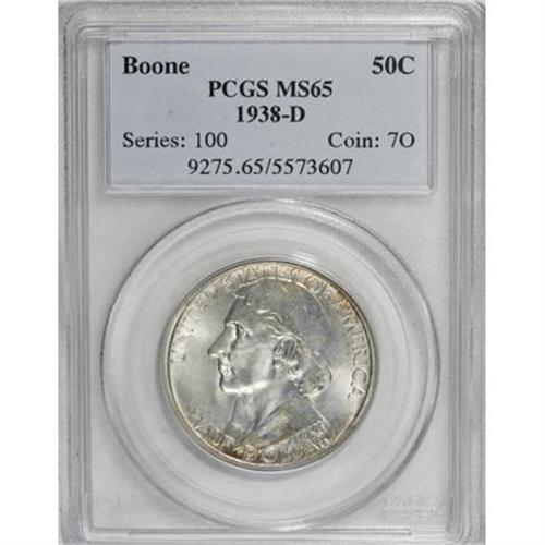 <B>1938-D 50C Boone MS65 PCGS.</B></I> PCGS Population (239/200). NGC Census: (159/150). Mintage: 2,100. Numismedia Wsl. Price for NGC/PCGS coin in MS65: $440. (#9275)<BR><BR><b>Shipping:</b> Coins & Currency (<a target="_blank" href="http://www.heritageauctions.com/common/shipping.php">view shipping information</a>)
