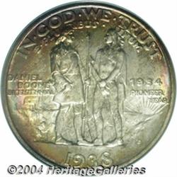 <table><tr><td><table><tr><td>1938-D 50C Boone MS67 PCGS. There is a patchwork of mottled colors on both sides that include orange, jade-green, crimson, and antique-gold hues. Not only is the eye appeal extraordinary, but the surfaces possess uncommonly strong technical merits that include a silky smooth sheen. Population: 27 in 67, with a mere three finer (3/04).From the Fox Valley Coin Commemoratives. <BR><BR><B>Important notice:</B> Heritage usually auctions material at the rate of 200-250 lots per hour. On some occasions eBay Live bid software or the Internet may not be able to keep up with the pace of the auction. We recommend placing a realistic absentee bid now as insurance to avoid disappointment. Occasionally the auctioneer may eliminate or reject an eBay Live bid, and the auctioneer may also reopen a lot after the close of the eBay live bidding (usually because we missed an audience bid), and may reject your bid even if it shows you as the winning bidder. By bidding via eBay Live, you agree that Heritage may award the lot to another bidder at its sole discretion under the circumstances described above or any other reasonable circumstances. Since eBay bids are not shown to us until we open the lot on the floor, we treat those bids just like floor bids. In most cases the floor responds before the eBay bid is presented to us, due to Internet lag time, so for consistency we have made it a policy that floor bids are always considered first over tie eBay live bids. Also please note that all Heritage lots purchased through eBay Live carry a 20% Buyer's Premium. Please make sure you read the Terms and Conditions before you bid. <BR><BR><B>IMPORTANT ANNOUNCEMENT ABOUT RESERVES:</B> Heritage now divulges all reserves on its web site 7 days before every auction. If you want to know whether the reserve on this lot has been met, and if not, what the reserve amount is, please visit this lot page on the HeritageCoin.com web site, or email: bid@HeritageGalleries.com </span></font></td></tr></table></td></tr></table>