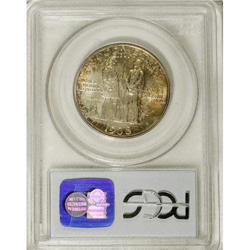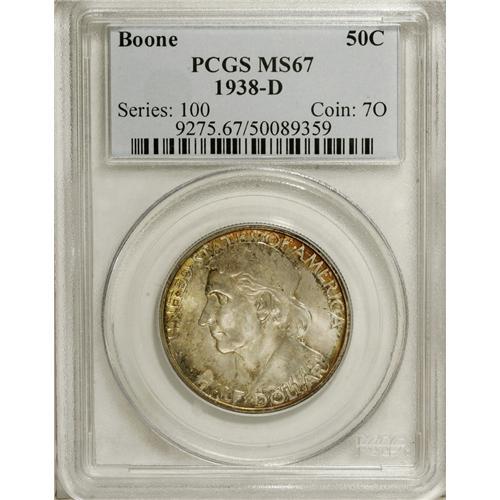 <B>1938-D 50C Boone MS67 PCGS.</B></I> This issue's mintage amounted to just 2,100 pieces, a feeble end to a five-year series of commemoratives that never saw a high level of production. The peripheral toning that appears on each side is gold-orange and red with a touch of violet at the lower reverse. A shining Superb Gem. Population: 42 in 67, 3 finer (3/07).<BR><I>From The Cary & Cheryl Porter Collection.</B></I><BR><BR><b>Shipping:</b> Coins & Currency (<a target="_blank" href="http://www.heritageauctions.com/common/shipping.php">view shipping information</a>)