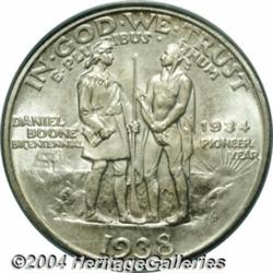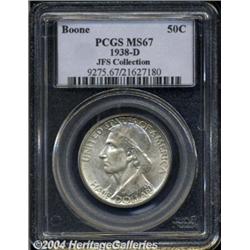 <B>1938-D<50C> Boone MS67 PCGS.</B></I> A highly lustrous and well struck Superb Gem that has essentially pristine surfaces. Lightly toned and lovely. The fifth and final year of the Bicentennial Boone issue. Originally issued as part of a PDS set, with a mintage of just 2,100 pieces. Population: 26 in 67, 3 finer (6/04).<BR><I>Ex: Atlanta ANA Signature Sale (Heritage, 8/01), lot 8488, which realized $1,897.50.</B></I><BR><I>From the JFS Collection, the #1 All-Time PCGS Registry Set.</B></I> <BR><BR><B>Important notice:</B> Heritage usually auctions material at the rate of 200-250 lots per hour. On some occasions eBay Live bid software or the Internet may not be able to keep up with the pace of the auction. We recommend placing a realistic absentee bid now as insurance to avoid disappointment. Occasionally the auctioneer may eliminate or reject an eBay Live bid, and the auctioneer may also reopen a lot after the close of the eBay live bidding (usually because we missed an audience bid), and may reject your bid even if it shows you as the winning bidder. By bidding via eBay Live, you agree that Heritage may award the lot to another bidder at its sole discretion under the circumstances described above or any other reasonable circumstances. Since eBay bids are not shown to us until we open the lot on the floor, we treat those bids just like floor bids. In most cases the floor responds before the eBay bid is presented to us, due to Internet lag time, so for consistency we have made it a policy that floor bids are always considered first over tie eBay live bids. Also please note that all Heritage lots purchased through eBay Live carry a 20% Buyer's Premium. Please make sure you read the Terms and Conditions before you bid. </span></font></tr></table></td></tr></table>