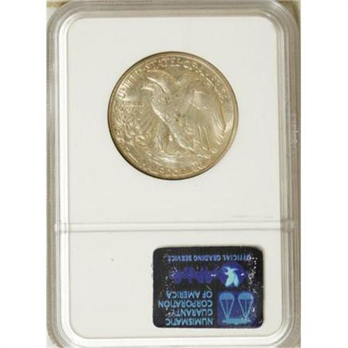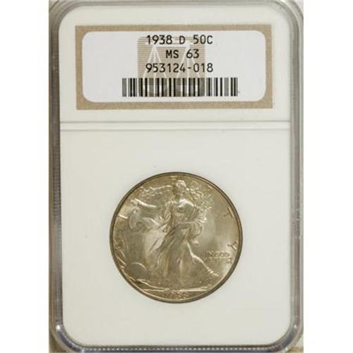 <B>1938-D 50C MS63 NGC.</B></I> The key-date of the post-1933 series of higher production Walking Liberty half dollars, and the only issue from 1934 to 1947 that had a mintage below 1 million coins, this lovely piece is boldly struck with light champagne toning over brilliant surfaces.<BR><BR><B>Coin Engraver:</B> Adolph A. Weinman<BR><BR><b>Shipping:</b> Coins & Currency (<a target="_blank" href="http://www.heritageauctions.com/common/shipping.php">view shipping information</a>)