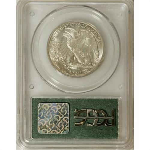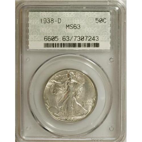 <B>1938-D 50C MS63 PCGS.</B></I> Light caramel-gold visits this satiny example. The reverse is well preserved, while the obverse has an inconspicuous graze on Liberty's neck. This low mintage Walking Liberty half is housed in a scarce doily label holder.<BR><BR><B>Coin Engraver:</B> Adolph A. Weinman<BR><BR><b>Shipping:</b> Coins & Currency (<a target="_blank" href="http://www.heritageauctions.com/common/shipping.php">view shipping information</a>)