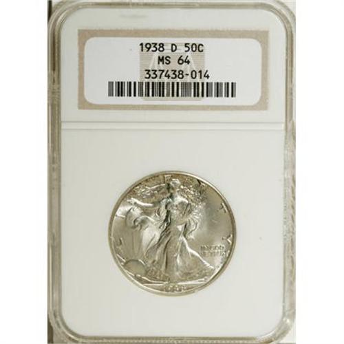 <B>1938-D 50C MS64 NGC.</B></I> This original near-Gem possesses dashes of russet toning, and booming luster traverses the clean surfaces. Liberty's head is well struck. A popular lower mintage date, housed in a prior generation holder.<BR><BR><B>Coin Engraver:</B> Adolph A. Weinman<BR><BR><b>Shipping:</b> Coins & Currency (<a target="_blank" href="http://www.heritageauctions.com/common/shipping.php">view shipping information</a>)
