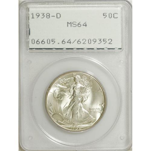 <B>1938-D 50C MS64 PCGS.</B></I> Honey and powder-blue shadings alternate across this lustrous and nicely struck near-Gem. A popular low mintage issue. Encapsulated in a first generation holder.<BR><BR><b>Shipping:</b> Coins & Currency (<a target="_blank" href="http://www.heritageauctions.com/common/shipping.php">view shipping information</a>)