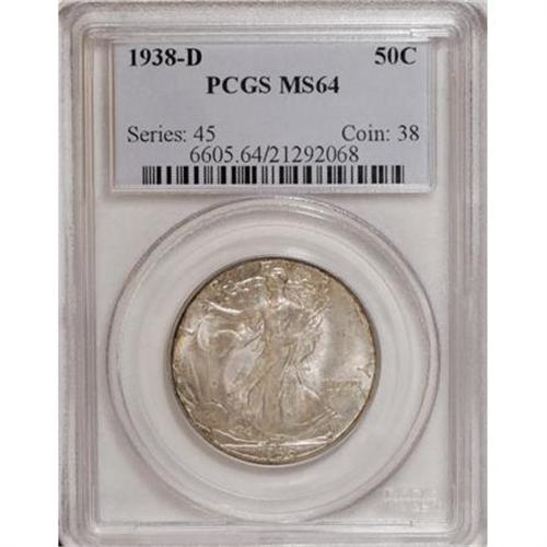 <B>1938-D 50C MS64 PCGS.</B></I> Subdued steely luster with light rose-gray accents and speckled russet, green, and gold peripheral patina. A number of tiny contact marks dot the surfaces, none of which are singularly distracting or out of line with the grade.<BR><BR><B>Coin Engraver:</B> Adolph A. Weinman<BR><BR><b>Shipping:</b> Coins & Currency (<a target="_blank" href="http://www.heritageauctions.com/common/shipping.php">view shipping information</a>)