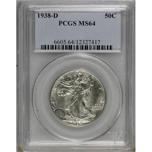 <B>1938-D 50C MS64 PCGS.</B></I> PCGS Population (660/1040). NGC Census: (333/460). Mintage: 491,600. Numismedia Wsl. Price for NGC/PCGS coin in MS64: $620. (#6605)<BR><BR><B>Coin Engraver:</B> Adolph A. Weinman<BR><BR><b>Shipping:</b> Coins & Currency (<a target="_blank" href="http://www.heritageauctions.com/common/shipping.php">view shipping information</a>)