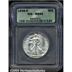 <B>1938-D<50C> MS65 ICG.</B></I> Fully lustrous, sharply struck, with a few light abrasions on the eagle's left wing. <BR><BR><B>Important notice:</B> Heritage usually auctions material at the rate of 200-250 lots per hour. On some occasions eBay Live bid software or the Internet may not be able to keep up with the pace of the auction. We recommend placing a realistic absentee bid now as insurance to avoid disappointment. Occasionally the auctioneer may eliminate or reject an eBay Live bid, and the auctioneer may also reopen a lot after the close of the eBay live bidding (usually because we missed an audience bid), and may reject your bid even if it shows you as the winning bidder. By bidding via eBay Live, you agree that Heritage may award the lot to another bidder at its sole discretion under the circumstances described above or any other reasonable circumstances. Since eBay bids are not shown to us until we open the lot on the floor, we treat those bids just like floor bids. In most cases the floor responds before the eBay bid is presented to us, due to Internet lag time, so for consistency we have made it a policy that floor bids are always considered first over tie eBay live bids. Also please note that all Heritage lots purchased through eBay Live carry a 20% Buyer's Premium. Please make sure you read the Terms and Conditions before you bid.
