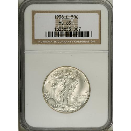 <B>1938-D 50C MS65 NGC.</B></I> A luscious and lustrous silver-white example of this always-popular late-series key. It is difficult for the present cataloger to decide which is more appealing, the radiant luster or the bold strike, but perhaps it suffices to say that both are head and shoulders above the typical Gem seen. A single dig through the head of Liberty is noted under a loupe.<BR><BR><b>Shipping:</b> Coin/Currency (<a target="_blank" href="http://www.heritageauctions.com/common/shipping.php">view shipping information</a>)