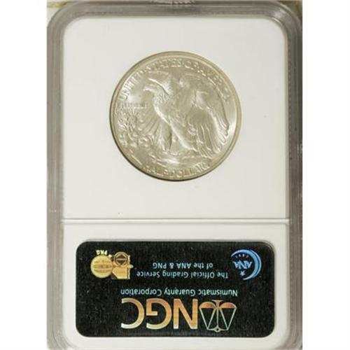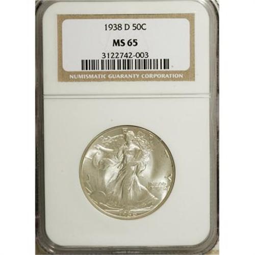 <B>1938-D 50C MS65 NGC.</B></I> Ivory and steel-blue toning, along with a shimmering, satiny finish, ensure the eye appeal of this nearly immaculate Gem. The centers are slightly soft, but this is a typical characteristic of the type that does not limit the technical grade of this lovely example. <BR><BR><B>Coin Engraver:</B> Adolph A. Weinman<BR><BR><b>Shipping:</b> Coins & Currency (<a target="_blank" href="http://www.heritageauctions.com/common/shipping.php">view shipping information</a>)