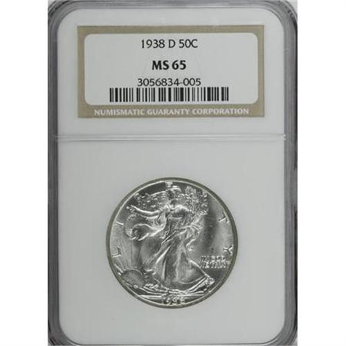 <B>1938-D 50C MS65 NGC.</B></I> Well struck for this Depression-era issue with strong, swirling luster that enlivens silver-white surfaces. A minimally toned Gem with undeniable visual appeal.<BR><BR><B>Coin Engraver:</B> Adolph A. Weinman<BR><BR><b>Shipping:</b> Coins & Currency (<a target="_blank" href="http://www.heritageauctions.com/common/shipping.php">view shipping information</a>)