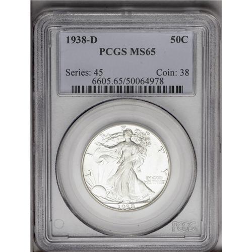 <B>1938-D<50C> MS65 PCGS.</B></I> A Gem specimen with shimmering mint brilliance and almost mark-free fields. A low mintage issue, considered the key to the later date Walking Liberty issues.