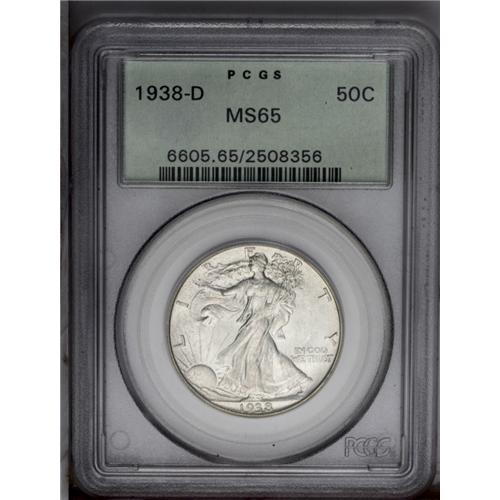 <B>1938-D<50C> MS65 PCGS.</B></I> A lustrous pearl-gray Gem of this popular low mintage issue. Nicely struck, and the reverse is particularly clean. Housed in a green label holder. <BR><BR><B>Important notice:</B> Heritage usually auctions material at the rate of 200-250 lots per hour. On some occasions eBay Live bid software or the Internet may not be able to keep up with the pace of the auction. We recommend placing a realistic absentee bid now as insurance to avoid disappointment. Occasionally the auctioneer may eliminate or reject an eBay Live bid, and the auctioneer may also reopen a lot after the close of the eBay live bidding (usually because we missed an audience bid), and may reject your bid even if it shows you as the winning bidder. By bidding via eBay Live, you agree that Heritage may award the lot to another bidder at its sole discretion under the circumstances described above or any other reasonable circumstances. Since eBay bids are not shown to us until we open the lot on the floor, we treat those bids just like floor bids. In most cases the floor responds before the eBay bid is presented to us, due to Internet lag time, so for consistency we have made it a policy that floor bids are always considered first over tie eBay live bids. Also please note that all Heritage lots purchased through eBay Live carry a 20% Buyer's Premium. Please make sure you read the Terms and Conditions before you bid. This lot is being auctioned in conjunction with a live floor auction by Heritage Galleries & Auctioneers. All final auction and invoice information will be supplied by Heritage Galleries & Auctioneers, and all other information should be considered preliminary. Lot:2973 <BR><BR><B>Winning Notification and Billing:</B> After the FINAL session in this auction is complete, Heritage will send e-mail and snail mail invoices. This process normally takes several days. All final auction and invoice information will be supplied by Heritage Galleries & Auctioneers, and all other information should be considered preliminary. <BR><BR>This auction will be conducted on a live auction floor and over the Internet through eBay Live. If you choose to place an absentee bid, please take a moment to <font color='#0000ff'><u><a href='http://pages.ebay.com/liveauctions/help/before/laabsentee.html'>learn how eBay Live absentee bidding works</a></u></font><font color='#000000'>