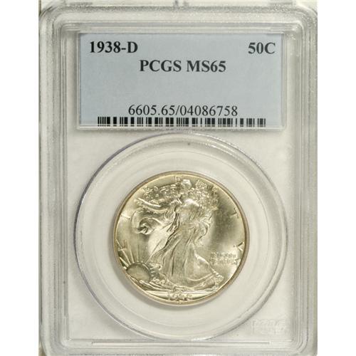 <B>1938-D 50C MS65 PCGS.</B></I> Intense luster radiates from both sides of this lovely Gem, that displays traces of light gold color. The gown lines stand out, and well preserved surfaces are devoid of significant marks.<BR><BR><b>Shipping:</b> Coins & Currency (<a target="_blank" href="http://www.heritageauctions.com/common/shipping.php">view shipping information</a>)