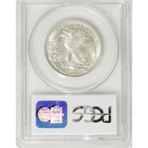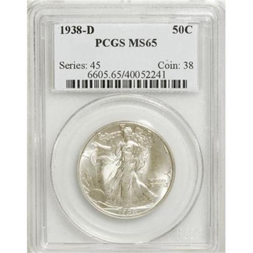 <B>1938-D 50C MS65 PCGS.</B></I> This issue had a relatively low mintage of 491,600 pieces. Survivors are not rare at the Gem level of preservation, but they do become scarce any finer. Boldly struck overall, if typically weak on Liberty's branch hand and the eagle's right (facing) leg. Faint sky-blue accents are seen on the obverse. A few tiny spots and contact marks preclude an even finer grade designation. <BR><I>From The Mario Eller Collection, Part Two.</B></I><BR><BR><B>Coin Engraver:</B> Adolph A. Weinman<BR><BR><b>Shipping:</b> Coins & Currency (<a target="_blank" href="http://www.heritageauctions.com/common/shipping.php">view shipping information</a>)