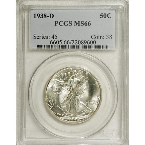 <B>1938-D 50C MS66 PCGS.</B></I> An attractive silver-white Premium Gem that has a modicum of detail on the branch hand. Highly lustrous with only a few incidental marks.<BR><BR><b>Shipping:</b> Coins & Currency (<a target="_blank" href="http://www.heritageauctions.com/common/shipping.php">view shipping information</a>)