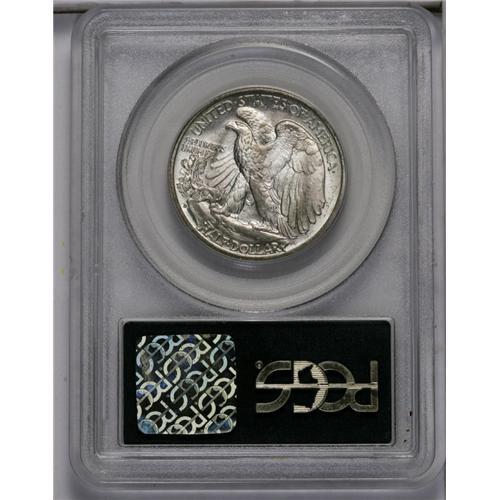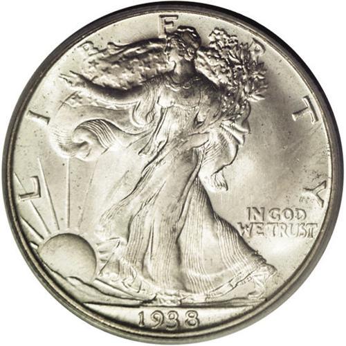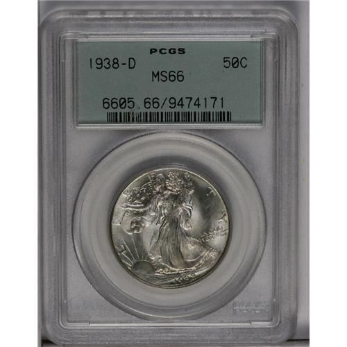 <B>1938-D<50C> MS66 PCGS.</B></I> Light powder-blue and chestnut toning. Crisply struck and well preserved. The 1938-D has the lowest mintage of any post-1921 business strike Walking Liberty half, and in fact the mintage is less than the key 1921-S. The 1938-D was set aside by knowledgeable collectors, similar to the 1938-D Buffalo nickel, but high grade examples remain desirable. Certified in an old green label holder.