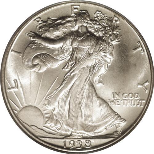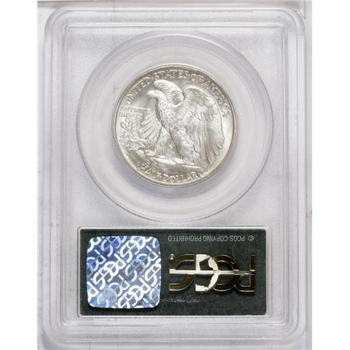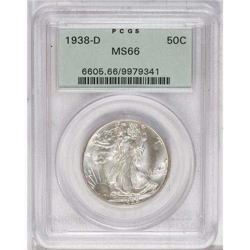 <B>1938-D<50C> MS66 PCGS.</B></I> The 1938-D seems to enjoy ceaseless demand from collectors of this beautiful series. Indeed, some modern-day collectors seem only to be acquiring examples of key dates in this and other series, apparently in expectation of even further price advances. The present example of this key-date issue is bright and untoned, with smooth, satiny fields. Certified in a green-label holder. PCGS has given a finer grade to 22 pieces (6/06).