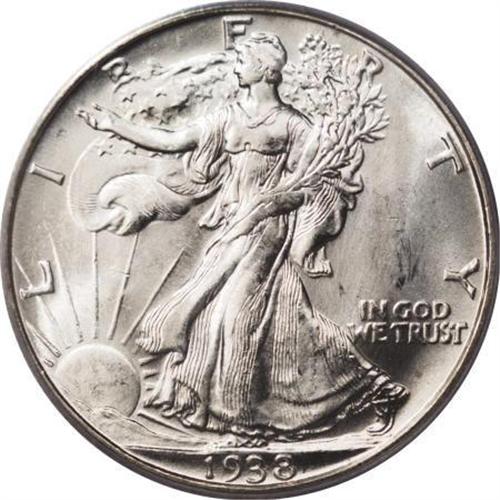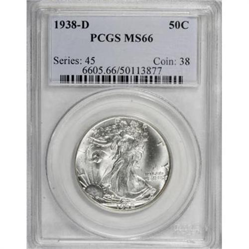 <B>1938-D 50C MS66 PCGS.</B></I> The key date of the short set Walkers with a mintage of only 491,600 coins. Although it is not particularly rare at this grade level, only 22 pieces have been graded finer by PCGS. A highly lustrous example with frosty silver surfaces and sharp design elements.<BR><BR><B>Coin Engraver:</B> Adolph A. Weinman<BR><BR><b>Shipping:</b> Coins & Currency (<a target="_blank" href="http://www.heritageauctions.com/common/shipping.php">view shipping information</a>)
