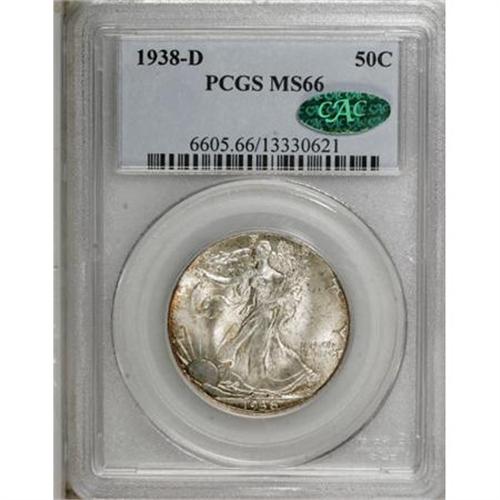 <B>1938-D 50C MS66 PCGS. CAC.</B></I> Dappled orange-tan patina races over the highly lustrous surfaces of this Premium Gem half dollar. Sharply struck, with just a few trivial grade-consistent marks.<BR><BR><B>Coin Engraver:</B> Adolph A. Weinman<BR><BR><b>Shipping:</b> Coins & Currency (<a target="_blank" href="http://www.heritageauctions.com/common/shipping.php">view shipping information</a>)