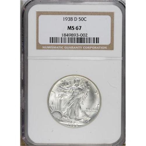 <B>1938-D 50C MS67 NGC.</B></I> A brilliant Superb Gem with no evidence of toning on either side. This is an exceptional example with satiny white luster created by extensive die polish in the fields on each side. Although not a full strike, the design definition is far finer than usual. This piece is tied as one of the finest examples certified by either NGC or PCGS. Census: 18 in 67, 0 finer (5/07). <BR><BR><b>Shipping:</b> Coins & Currency (<a target="_blank" href="http://www.heritageauctions.com/common/shipping.php">view shipping information</a>)