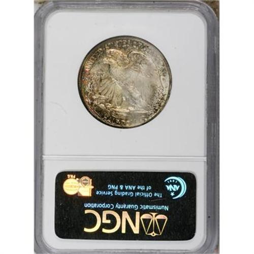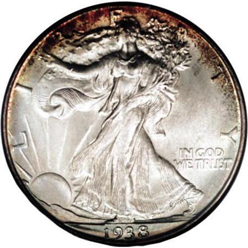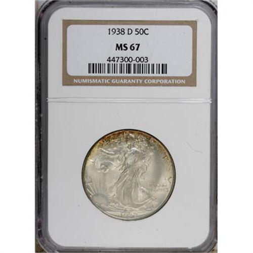 <B>1938-D 50C MS67 NGC.</B></I> The so-called "short set" of Walking Liberty half dollars was created by the album publishes, such as Whitman and others, long before the days of coin certification. Back in the old days, when collectors actually placed their coins in these different albums, two physical books were required for the complete collection of Walking Liberty half dollars. One particular album set had one volume for 1916 to 1933 half dollars, and the other for the 1934 to 1947 series. Short sets exist because some collectors simply didn't buy the first volume, and only concentrated on filling the second volume.<BR> The 1938-D is the key to the 1934-1947 short set, and it is the only issue within the set that had a mintage of less than 1 million coins. This Superb Gem piece is fully lustrous with frosty silver surfaces that are enhanced by lovely peripheral iridescence, deeper on the reverse. Census: 18 in 67, 0 finer (6/07).<BR><BR><B>Coin Engraver:</B> Adolph A. Weinman<BR><BR><b>Shipping:</b> Coins & Currency (<a target="_blank" href="http://www.heritageauctions.com/common/shipping.php">view shipping information</a>\)