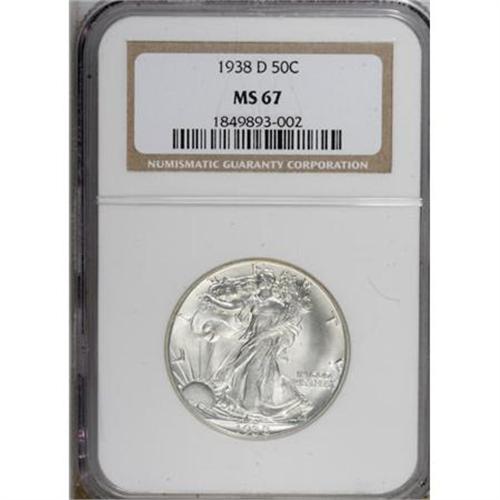 <B>1938-D 50C MS67 NGC.</B></I> A brilliant Superb Gem with no evidence of toning on either side. This is an exceptional example with satiny white luster created by extensive die polish in the fields on each side. Although not a full strike, the design definition is far finer than usual. This piece is tied for the finest examples certified by either NGC or PCGS. Census: 18 in 67, 0 finer (8/07).<BR><BR><B>Coin Engraver:</B> Adolph A. Weinman<BR><BR><b>Shipping:</b> Coins & Currency (<a target="_blank" href="http://www.heritageauctions.com/common/shipping.php">view shipping information</a>)
