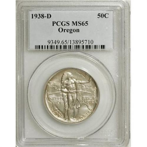 <B>1938-D 50C Oregon MS65 PCGS.</B></I> PCGS Population (628/752). NGC Census: (318/760). Mintage: 6,005. Numismedia Wsl. Price for NGC/PCGS coin in MS65: $264. (#9349)<BR><I>From The Frank DuVall Collection of U.S. Commemoratives.</B></I><BR><BR><b>Shipping:</b> Coins & Currency (<a target="_blank" href="http://www.heritageauctions.com/common/shipping.php">view shipping information</a>\)