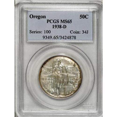 <B>1938-D 50C Oregon MS65 PCGS.</B></I> PCGS Population (629/759). NGC Census: (320/764). Mintage: 6,005. Numismedia Wsl. Price for NGC/PCGS coin in MS65: $264. (#9349)<BR><BR><b>Shipping:</b> Coins & Currency (<a target="_blank" href="http://www.heritageauctions.com/common/shipping.php">view shipping information</a>\)