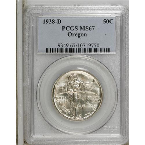 <B>1938-D 50C Oregon MS67 PCGS.</B></I> Crisply struck with a lovely satiny sheen and a mostly untoned appearance. Slight hints of amber and russet color are noticed mainly under magnification. Each side is near-pristine.<BR><BR><b>Shipping:</b> Coins & Currency (<a target="_blank" href="http://www.heritageauctions.com/common/shipping.php">view shipping information</a>)