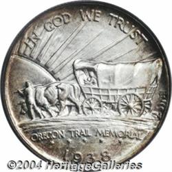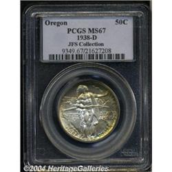 <B>1938-D<50C> Oregon MS67 PCGS.</B></I> Pastel lime-green, powder-blue, and honey-gold colors grace the peripheries, while the centers are untoned. A satiny Superb Gem with unmarked surfaces and a sharp strike on the backs of the oxen, although the rear of the covered wagon is not fully brought up by the dies. A lovely representative of this scarce issue, one of a mere 6,005 pieces struck.<BR><I>Ex: FUN Signature Sale (Heritage, 1/02), as part of lot 8839, which realized $3,450.</B></I><BR><I>From the JFS Collection, the #1 All-Time PCGS Registry Set.</B></I> <BR><BR><B>Important notice:</B> Heritage usually auctions material at the rate of 200-250 lots per hour. On some occasions eBay Live bid software or the Internet may not be able to keep up with the pace of the auction. We recommend placing a realistic absentee bid now as insurance to avoid disappointment. Occasionally the auctioneer may eliminate or reject an eBay Live bid, and the auctioneer may also reopen a lot after the close of the eBay live bidding (usually because we missed an audience bid), and may reject your bid even if it shows you as the winning bidder. By bidding via eBay Live, you agree that Heritage may award the lot to another bidder at its sole discretion under the circumstances described above or any other reasonable circumstances. Since eBay bids are not shown to us until we open the lot on the floor, we treat those bids just like floor bids. In most cases the floor responds before the eBay bid is presented to us, due to Internet lag time, so for consistency we have made it a policy that floor bids are always considered first over tie eBay live bids. Also please note that all Heritage lots purchased through eBay Live carry a 20% Buyer's Premium. Please make sure you read the Terms and Conditions before you bid. </span></font></tr></table></td></tr></table>