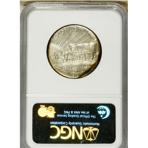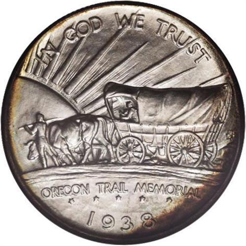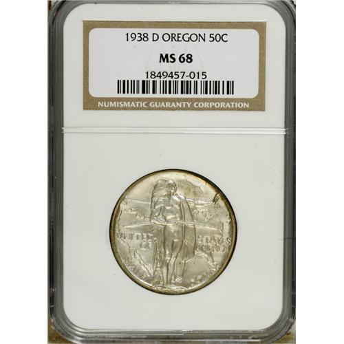 <B>1938-D 50C Oregon MS68 NGC.</B></I> Superb Gem examples of this issue are relatively plentiful, despite a low mintage of just 6,005 pieces. This piece is tied for the finest certified by NGC, with frosty silver luster and splashes of iridescent toning at the border, mostly on the reverse.<BR><BR><b>Shipping:</b> Coins & Currency (<a target="_blank" href="http://www.heritageauctions.com/common/shipping.php">view shipping information</a>)