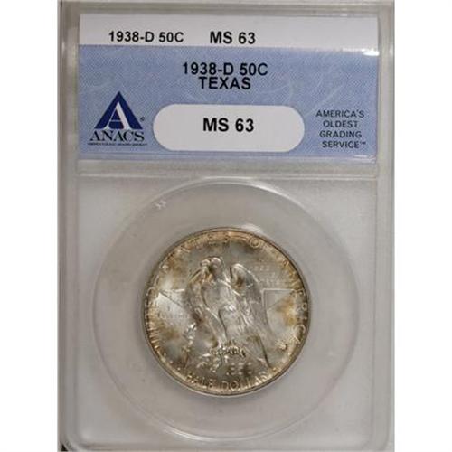 <B>1938-D 50C Texas MS63 ANACS.</B></I> . NGC Census: (18/696). PCGS Population (114/989). Mintage: 3,775. Numismedia Wsl. Price for NGC/PCGS coin in MS63: $217. (#9395)<BR><BR><b>Shipping:</b> Coins & Currency (<a target="_blank" href="http://www.heritageauctions.com/common/shipping.php">view shipping information</a>)